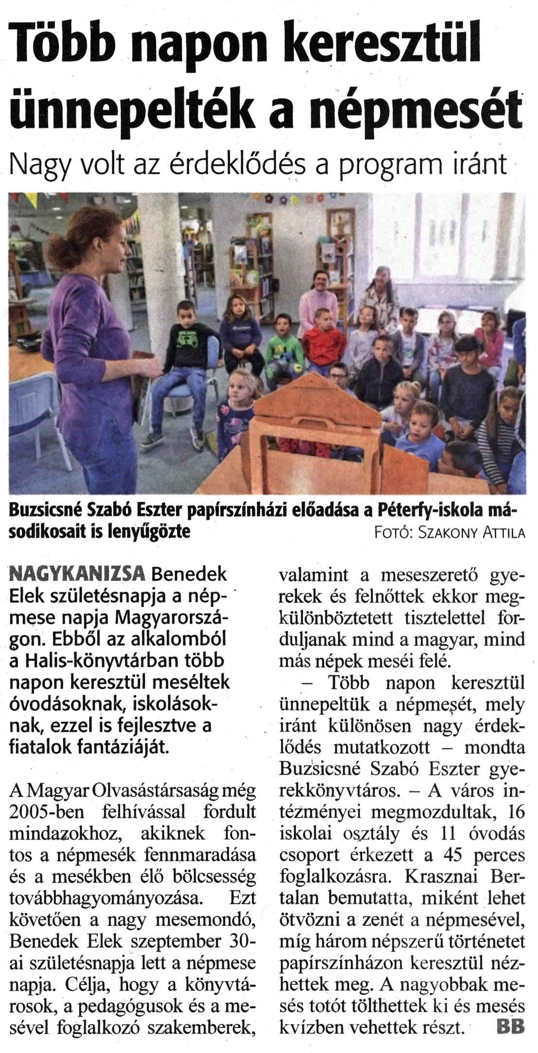 Nyilvános 1310 | 1509 | Zalai Hírlap 2022. október 6. 233. szám 1. oldal | Több napon keresztül ünnepelték a népmesét Nagy volt az érdeklődés a program iránt Buzsicsné Szabó Eszter papírszínházi előadása a Péterfy-iskola másodikosait is lenyűgözte Fotó: Szakony Attila NAGYKANIZSA Benedek Elek születésnapja a népmese napja Magyarországon. Ebből az alkalomból a Halis-könyvtárban több napon keresztül meséltek óvodásoknak, iskolásoknak, ezzel is fejlesztve a fiatalok fantáziáját. A Magyar Olvasástársaság még 2005-ben felhívással fordult mindazokhoz, akiknek fontos a népmesék fennmaradása és a mesékben élő bölcsesség továbbhagyományozása. Ezt követően a nagy mesemondó, Benedek Elek szeptember 30-ai születésnapja lett a népmese napja. Célja, hogy a könyvtárosok, a pedagógusok és a mesével foglalkozó szakemberek, valamint a meseszerető gyerekek és felnőttek ekkor megkülönböztetett tisztelettel forduljanak mind a magyar, mind más népek meséi felé. - Több napon keresztül ünnepeltük a népmesét, mely iránt különösen nagy érdeklődés mutatkozott - mondta Buzsicsné Szabó Eszter gyerekkönyvtáros. - A város intézményei megmozdultak, 16 iskolai osztály és 11 óvodás csoport érkezett a 45 perces foglalkozásra. Krasznai Bertalan bemutatta, miként lehet ötvözni a zenét a népmesével, míg három népszerű történetet papírszínházon keresztül nézhettek meg. A nagyobbak mesés totót tölthettek ki és mesés kvízben vehettek részt. BB |
