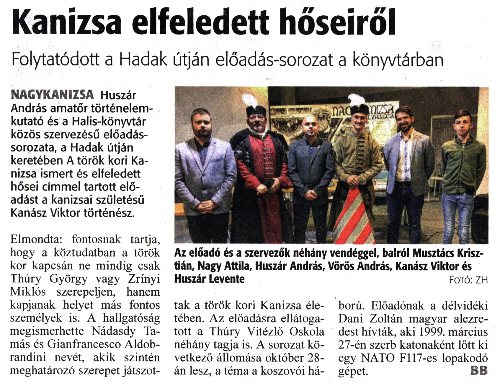 Nyilvános 1207 | 1440 | Zalai Hírlap 2022. október 19. 244. szám 3. oldal | Kanizsa elfeledett hőseiről Folytatódott a Hadak útján előadás-sorozat a könyvtárban NAGYKANIZSA Huszár András amatőr történelemkutató és a Halis-könyvtár közös szervezésű előadássorozata, a Hadak útján keretében A török kori Kanizsa ismert és elfeledett hősei címmel tartott előadást a kanizsai születésű Kanász Viktor történész. Elmondta: fontosnak tartja, hogy a köztudatban a török kor kapcsán ne mindig csak Thúry György vagy Zrínyi Miklós szerepeljen, hanem kapjanak helyet más fontos személyek is. A hallgatóság megismerhette Nádasdy Tamás és Gianfrancesco Aldobrandini nevét, akik szintén meghatározó szerepet játszottak a török kori Kanizsa életében. Az előadásra ellátogatott a Thúry Vitézlő Oskola néhány tagja is. A sorozat következő állomása október 28-án lesz, a téma a koszovói háború. Előadónak a délvidéki Dani Zoltán magyar alezredest hívták, aki 1999. március 27-én szerb katonaként lőtt ki egy NATO F117-es lopakodó gépet. BB Az előadó és a szervezők néhány vendéggel, balról Musztács Krisztián, Nagy Attila, Huszár András, Vörös András, Kanász Viktor és Huszár Levente Fotó: ZH |