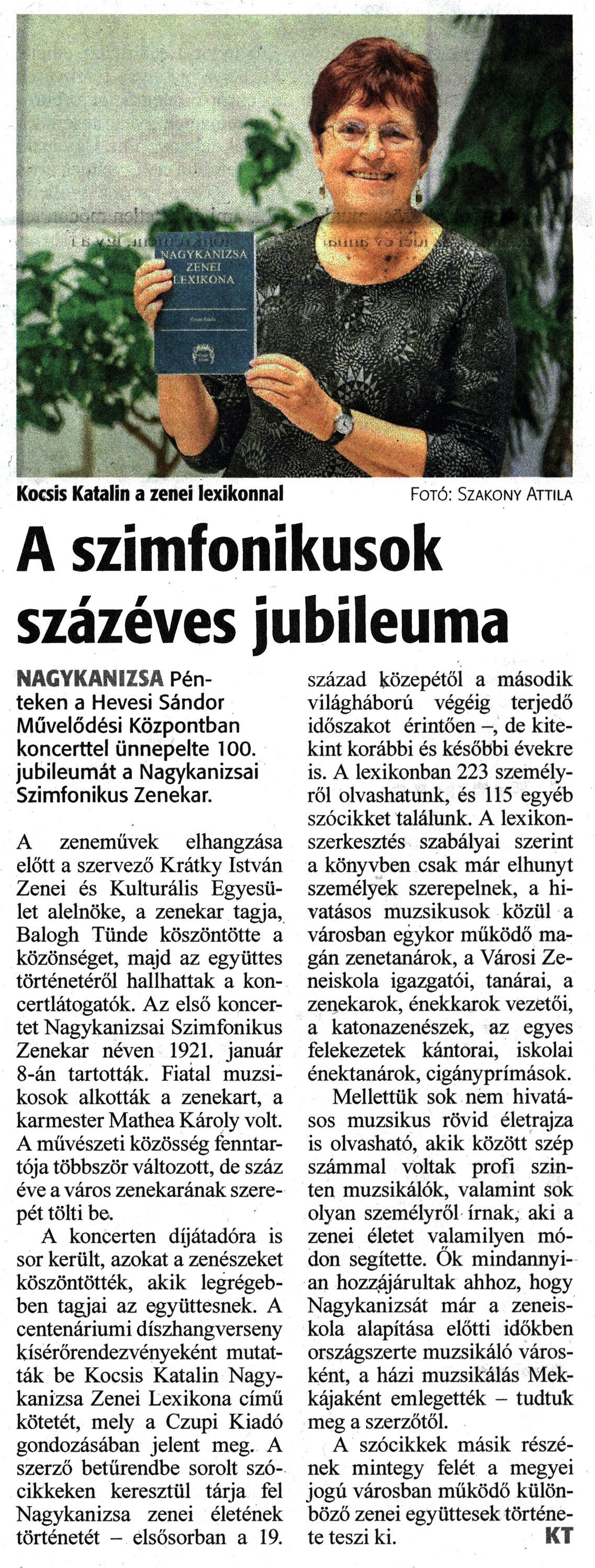 Nyilvános 1147 | 1737 | Zalai Hírlap 2022. október 31. 254. szám 4. oldal | Kocsis Katalin a zenei lexikonnal Fotó: Szakony Attila A szimfonikusok százéves jubileuma NAGYKANIZSA Pénteken a Hevesi Sándor Művelődési Központban koncerttel ünnepelte 100. jubileumát a Nagykanizsai Szimfonikus Zenekar. A zeneművek elhangzása előtt a szervező Krátky István Zenei és Kulturális Egyesület alelnöke, a zenekar tagja, Balogh Tünde köszöntötte a közönséget, majd az együttes történetéről hallhattak a koncertlátogatók. Az első koncertet Nagykanizsai Szimfonikus Zenekar néven 1921. január 8-án tartották. Fiatal muzsikosok alkották a zenekart, a karmester Mathea Károly volt. A művészeti közösség fenntartója többször változott, de száz éve a város zenekarának szerepét tölti be. A koncerten díjátadóra is sor került, azokat a zenészeket köszöntötték, akik legrégebben tagjai az együttesnek. A centenáriumi díszhangverseny kísérőrendezvényeként mutatták be Kocsis Katalin Nagykanizsa Zenei Lexikona című kötetét, mely a Czupi Kiadó gondozásában jelent meg. A szerző betűrendbe sorolt szócikkeken keresztül tárja fel Nagykanizsa zenei életének történetét - elsősorban a 19. század közepétől a második világháború végéig terjedő időszakot érintően -, de kitekint korábbi és későbbi évekre is. A lexikonban 223 személyről olvashatunk, és 115 egyéb szócikket találunk. A lexikonszerkesztés szabályai szerint a könyvben csak már elhunyt személyek szerepelnek, a hivatásos muzsikusok közül a városban egykor működő magán zenetanárok, a Városi Zeneiskola igazgatói, tanárai, a zenekarok, énekkarok vezetői, a katonazenészek, az egyes felekezetek kántorai, iskolai énektanárok, cigányprímások. Mellettük sok nem hivatásos muzsikus rövid életrajza is olvasható, akik között szép számmal voltak profi szinten muzsikálók, valamint sok olyan személyről írnak, aki a zenei életet valamilyen módon segítette. Ők mindannyian hozzájárultak ahhoz, hogy Nagykanizsát már a zeneiskola alapítása előtti időkben országszerte muzsikáló városként, a házi muzsikálás Mekkájaként emlegették - tudtuk meg a szerzőtől. A szócikkek másik részének mintegy felét a megyei jogú városban működő különböző zenei együttesek története teszi ki. KT |