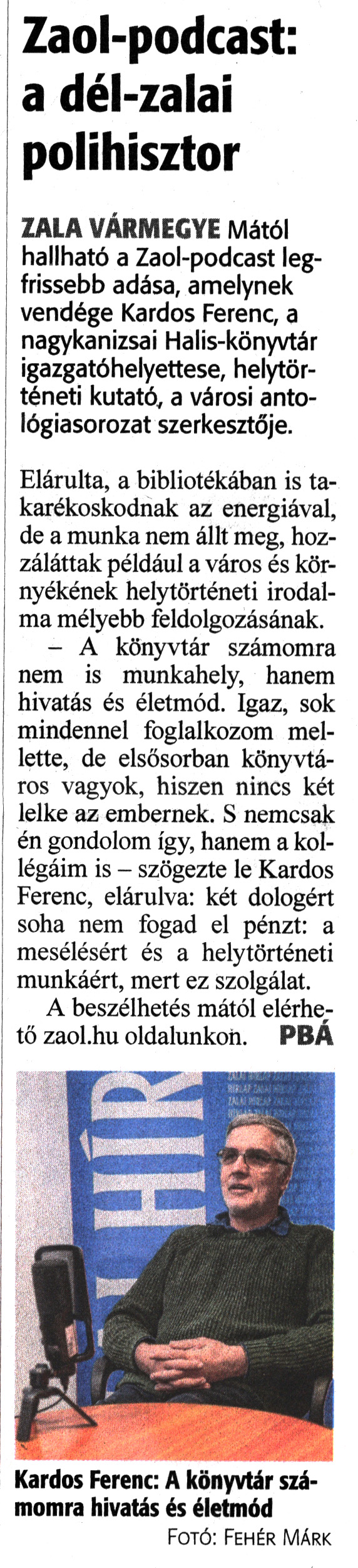 Nyilvános 1094 | 1409 | Zalai Hírlap 2023. február 10. 35. szám 1. oldal | Zaol-podcast: a dél-zalai polihisztor ZALA VÁRMEGYE Mától hallható a Zaol-podcast legfrissebb adása, amelynek vendége Kardos Ferenc, a nagykanizsai Halis-könyvtár igazgatóhelyettese, helytörténeti kutató, a városi antológiasorozat szerkesztője. Elárulta, a bibliotékában is takarékoskodnak az energiával, de a munka nem állt meg, hozzáláttak például a város és környékének helytörténeti irodalma mélyebb feldolgozásának. - A könyvtár számomra nem is munkahely, hanem hivatás és életmód. Igaz, sok mindennel foglalkozom mellette, de elsősorban könyvtáros vagyok, hiszen nincs két lelke az embernek. S nemcsak én gondolom így, hanem a kollégáim is - szögezte le Kardos Ferenc, elárulva: két dologért soha nem fogad el pénzt: a mesélésért és a helytörténeti munkáért, mert ez szolgálat. A beszélhetés mától elérhető zaol.hu oldalunkon. PBÁ Kardos Ferenc: A könyvtár számomra hivatás és életmód Fotó: Fehér Márk |