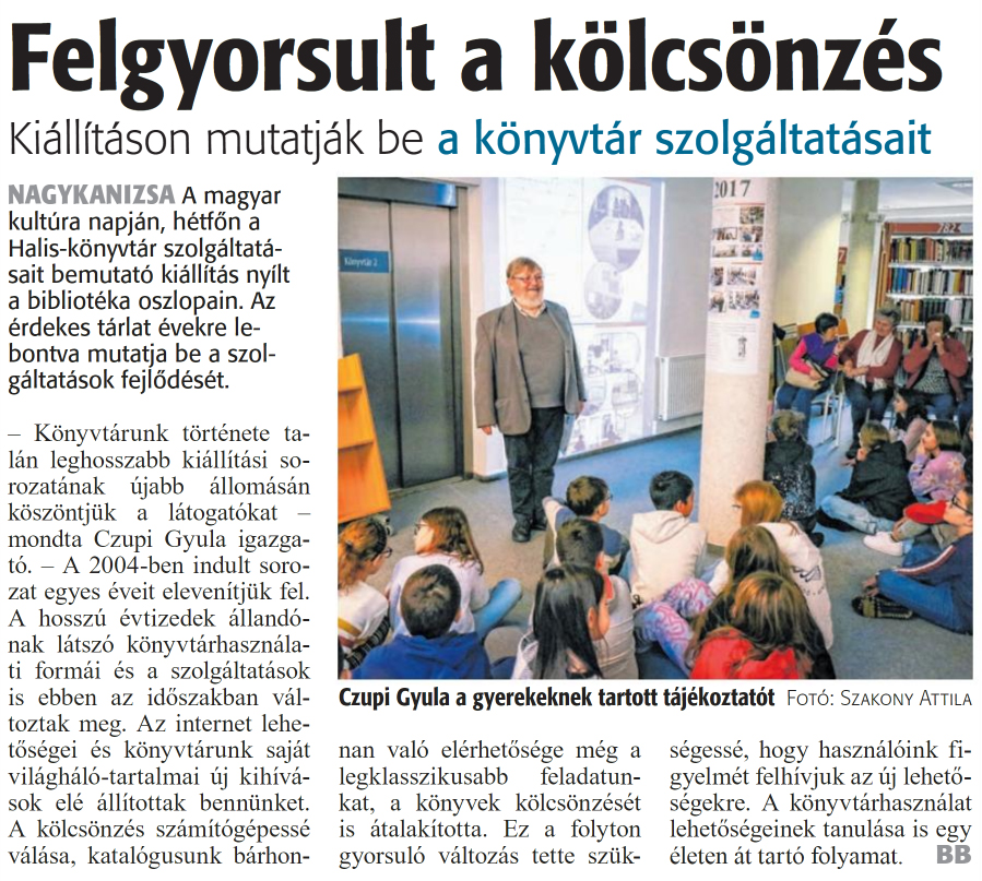 Nyilvános 1022 | 1522 | Zalai Hírlap 2024. január 23. 19. szám 16. oldal | Felgyorsult a kölcsönzés Kiállításon mutatják be a könyvtár szolgáltatásait NAGYKANIZSA A magyar kultúra napján, hétfőn a Halis-könyvtár szolgáltatásait bemutató kiállítás nyílt a bibliotéka oszlopain. Az érdekes tárlat évekre lebontva mutatja be a szolgáltatások fejlődését. - Könyvtárunk története talán leghosszabb kiállítási sorozatának újabb állomásán köszöntjük a látogatókat -mondta Czupi Gyula igazgató. - A 2004-ben indult sorozat egyes éveit elevenítjük fel. A hosszú évtizedek állandónak látszó könyvtárhasználati formái és a szolgáltatások is ebben az időszakban változtak meg. Az internet lehetőségei és könyvtárunk saját világháló-tartalmai új kihívások elé állítottak bennünket. A kölcsönzés számítógépessé válása, katalógusunk bárhonnan való elérhetősége még a legklasszikusabb feladatunkat, a könyvek kölcsönzését is átalakította. Ez a folyton gyorsuló változás tette szükségessé, hogy használóink figyelmét felhívjuk az új lehetőségekre. A könyvtárhasználat lehetőségeinek tanulása is egy életen át tartó folyamat. BB Czupi Gyula a gyerekeknek tartott tájékoztatót Fotó: Szakony Attila |