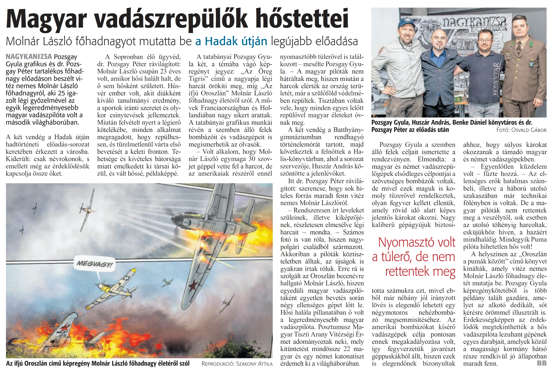 Nyilvános 968 | 1311 | Zalai Hírlap 2024. május 8. 106. szám 5. oldal | Magyar vadászrepülők hőstettei Molnár László főhadnagyot mutatta be a Hadak útján legújabb előadása Pozsgay Gyula, Huszár András, Benke Dániel könyvtáros és dr. Pozsgay Péter az előadás után Fotó: Osvald Gábor NAGYKANIZSA Pozsgay Gyula grafikus és dr. Pozsgay Péter tartalékos főhadnagy előadáson beszélt vitéz nemes Molnár László főhadnagyról, aki 25 igazolt légi győzelmével az egyik legeredményesebb magyar vadászpilóta volt a második világháborúban. A két vendég a Hadak útján hadtörténeti előadás-sorozat keretében érkezett a városba. Kiderült: csak névrokonok, s emellett még az érdeklődésük kapcsolja össze őket. A Sopronban élő ügyvéd, dr. Pozsgay Péter rávilágított: Molnár László csupán 23 éves volt, amikor hősi halált halt, de ő sem hősként született. Húsvér ember volt, akit diákként kiváló tanulmányi eredmény, a sportok iránti szeretet és olykor csínytevések jellemeztek. Miután felvételt nyert a légierő kötelékébe, minden alkalmat megragadott, hogy repülhessen, és türelmetlenül várta első bevetését a keleti fronton. Tehetsége és kivételes bátorsága miatt emelkedett ki társai közül, és vált hőssé, példaképpé. A tatabányai Pozsgay Gyula két, a témába vágó képregényt jegyez: „Az Öreg Tigris" című a nagyapja légi harcát örökíti meg, míg „Az ifjú Oroszlán" Molnár László főhadnagy életéről szól. A művek Franciaországban és Hollandiában nagy sikert arattak. A tatabányai grafikus munkái révén a szemben álló felek bombázóit és vadászgépeit is megismerhetik az olvasók. - Volt alkalom, hogy Molnár László egymaga 30 szovjet géppel vette fel a harcot, de az amerikaiak részéről ennél nyomasztóbb túlerővel is találkozott - mesélte Pozsgay Gyula. - A magyar pilóták nem hátráltak meg, hiszen miután a harcok elérték az ország területét, már a szülőföld védelmében repültek. Tisztában voltak vele, hogy minden egyes lelőtt repülővel magyar életeket óvnak meg. A két vendég a Batthyány-gimnáziumban rendhagyó történelemórát tartott, majd következtek a felnőttek a Halis-könyvtárban, ahol a sorozat szervezője, Huszár András köszöntötte a jelenlévőket. Itt dr. Pozsgay Péter rávilágított: szerencse, hogy sok hiteles forrás maradt fenn vitéz nemes Molnár Lászlóról. - Rendszeresen írt leveleket szüleinek, illetve kiképzőjének, részletesen elmesélve légi harcait - mondta. - Számos fotó is van róla, hiszen nagypolgári családból származott. Akkoriban a pilóták köztiszteletben álltak, az újságok is gyakran irtak róluk. Erre rá is szolgált az Oroszlán becenévre hallgató Molnár László, hiszen egyedüli magyar vadászpilótaként egyetlen bevetés során négy ellenséges gépet lőtt le. Hősi halála pillanatában ő volt a legeredményesebb magyar vadászpilóta. Posztumusz Magyar Tiszti Arany Vitézségi Érmet adományoztak neki, mely kitüntetést mindössze 22 magyar és egy német katonatiszt érdemelt ki a világháborúban. Pozsgay Gyula a szemben álló felek céljait ismertette a rendezvényen. Elmondta: a magyar és német vadászrepülőgépek elsődleges célpontjai a szövetséges bombázók voltak, de mivel ezek maguk is komoly tűzerővel rendelkeztek, olyan fegyver kellett ellenük, amely rövid idő alatt képes jelentős károkat okozni. Nagy kaliberű gépágyújuk biztositotta számukra ezt, mivel ebből már néhány jól irányzott lövés is elegendő lehetett egy négymotoros nehézbombázó megsemmisítéséhez. Az amerikai bombázókat kísérő vadászgépek célja pontosan ennek megakadályozása volt, így fegyverzetük javarészt géppuskákból állt, hiszen ezek is elegendőnek bizonyultak ahhoz, hogy súlyos károkat okozzanak a támadó magyar és német vadászgépekben. - Egyenlőtlen küzdelem volt - fűzte hozzá. - Az ellenséges erők hatalmas számbeli, illetve a háború utolsó szakaszában már technikai fölényben is voltak. De a magyar pilóták nem rettentek meg a veszélytől, sok esetben az utolsó töltényig harcoltak, esküjükhöz híven, a hazáért mindhalálig. Mindegyik Puma pilóta hihetetlen hős volt! A helyszínen az „Oroszlán a pumák között" című könyvet kínálták, amely vitéz nemes Molnár László főhadnagy életét mutatja be. Pozsgay Gyula képregénykötetéből is több példány talált gazdára, amelyet az alkotó dedikált, sőt kérésre örömmel illusztrált is. Érdekességképpen az érdeklődők megtekinthették a hős vadászpilóta lezuhant gépének egyes darabjait, amelyek közül a magassági kormány hátsó része rendkívül jó állapotban maradt fenn. BB Az ifjú Oroszlán című képregény Molnár László főhadnagy életéről szól Reprodukció: Szakony Attila |