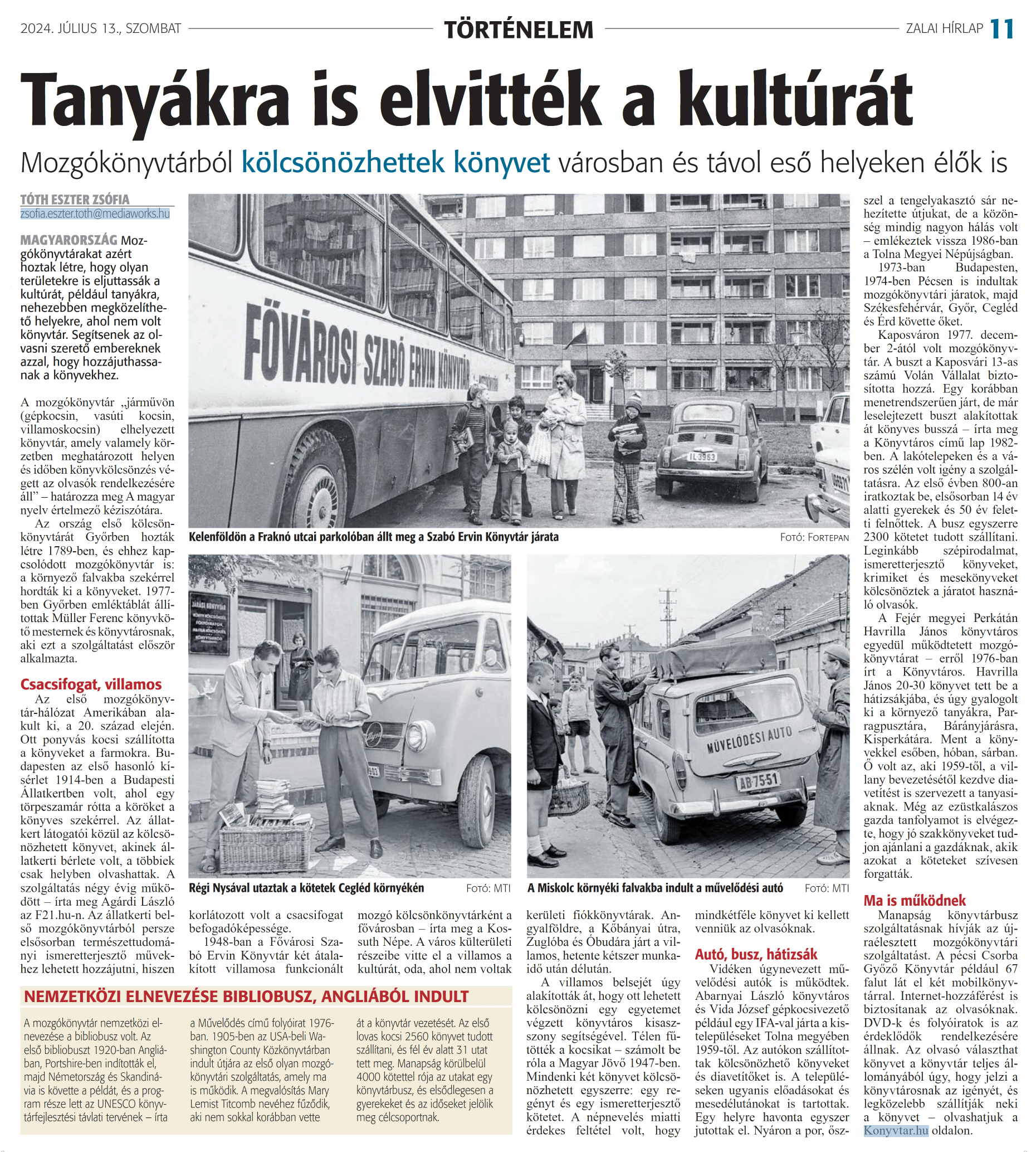 Nyilvános 951 | 1188 | Zalai Hírlap 2024. július 13. 162. szám 11. oldal | Tanyákra is elvitték a kultúrát Mozgókönyvtárból kölcsönözhettek könyvet városban és távol eső helyeken élők is TÓTH ESZTER ZSÓFIA zsofia.eszter.toth@mediaworks.hu MAGYARORSZÁG Mozgókönyvtárakat azért hoztak létre, hogy olyan területekre is eljuttassák a kultúrát, például tanyákra, nehezebben megközelíthető helyekre, ahol nem volt könyvtár. Segítsenek az olvasni szerető embereknek azzal, hogy hozzájuthassanak a könyvekhez. A mozgókönyvtár „járművön (gépkocsin, vasúti kocsin, villamoskocsin) elhelyezett könyvtár, amely valamely körzetben meghatározott helyen és időben könyvkölcsönzés végett az olvasók rendelkezésére áll" - határozza meg A magyar nyelv értelmező kéziszótára. Az ország első kölcsön-könyvtárát Győrben hozták létre 1789-ben, és ehhez kapcsolódott mozgókönyvtár is: a környező falvakba szekérrel hordták ki a könyveket. 1977-ben Győrben emléktáblát állítottak Müller Ferenc könyvkötő mesternek és könyvtárosnak, aki ezt a szolsáltatást először alkalmazta. Az első mozgókönyvtár-hálózat Amerikában alakult ki, a 20. század elején. Ott ponyvás kocsi szállította a könyveket a farmokra. Budapesten az első hasonló kísérlet 1914-ben a Budapesti Állatkertben volt, ahol egy törpeszamár rótta a köröket a könyves szekérrel. Az állatkert látogatói közül az kölcsönözhetett könyvet, akinek állatkerti bérlete volt, a többiek csak helyben olvashattak. A szolgáltatás négy évig működött - írta meg Agárdi László az F21.hu-n. Az állatkerti belső mozgókönyvtárból persze elsősorban természettudományi ismeretterjesztő müvekhez lehetett hozzájutni, hiszen korlátozott volt a csacsifogat befogadóképessége. 1948-ban a Fővárosi Szabó Ervin Könyvtár két átalakított villamosa funkcionált mozgó kölcsönkönyvtárként a fővárosban - írta meg a Kossuth Népe. A város külterületi részeibe vitte el a villamos a kultúrát, oda, ahol nem voltak kerületi fiókkönyvtárak. Angyalföldre, a Kőbányai útra, Zuglóba és Óbudára járt a villamos, hetente kétszer munkaidő után délután. A villamos belsejét úgy alakították át, hogy ott lehetett kölcsönözni egy egyetemet végzett könyvtáros kisasszony segítségével. Télen fűtötték a kocsikat - számolt be róla a Magyar Jövő 1947-ben. Mindenki két könyvet kölcsönözhetett egyszerre: egy regényt és egy ismeretterjesztő kötetet. A népnevelés miatti érdekes feltétel volt, hogy mindkétféle könyvet ki kellett venniük az olvasóknak. Vidéken úgynevezett művelődési autók is működtek. Abarnyai László könyvtáros és Vida József gépkocsivezető például egy IFA-val járta a kistelepüléseket Tolna megyében 1959-től. Az autókon szállítottak kölcsönözhető könyveket és diavetítőket is. A településeken ugyanis előadásokat és mesedélutánokat is tartottak. Egy helyre havonta egyszer jutottak el. Nyáron a por, ősszel a tengelyakasztó sár nehezítette útjukat, de a közönség mindig nagyon hálás volt - emlékeztek vissza 1986-ban a Tolna Megyei Népújságban. 1973-ban Budapesten, 1974-ben Pécsen is indultak mozgókönyvtári járatok, majd Székesfehérvár, Győr, Cegléd és Érd követte őket. Kaposváron 1977. december 2-ától volt mozgókönyvtár. A buszt a Kaposvári 13-as számú Volán Vállalat biztosította hozzá. Egy korábban menetrendszerűen járt, de már leselejtezett buszt alakítottak át könyves busszá - írta meg a Könyvtáros című lap 1982-ben. A lakótelepeken és a város szélén volt igény a szolgáltatásra. Az első évben 800-an iratkoztak be, elsősorban 14 év alatti gyerekek és 50 év feletti felnőttek. A busz egyszerre 2300 kötetet tudott szállítani. Leginkább szépirodalmat, ismeretterjesztő könyveket, krimiket és mesekönyveket kölcsönöztek a járatot használó olvasók. A Fejér megyei Perkátán Havrilla János könyvtáros egyedül működtetett mozgókönyvtárat - erről 1976-ban írt a Könyvtáros. Havrilla János 20-30 könyvet tett be a hátizsákjába, és úgy gyalogolt ki a környező tanyákra, Parragpusztára, Bárányjárásra, Kisperkátára. Ment a könyvekkel esőben, hóban, sárban. Ő volt az, aki 1959-től, a villany bevezetésétől kezdve diavetítést is szervezett a tanyasiaknak. Még az ezüstkalászos gazda tanfolyamot is elvégezte, hogy jó szakkönyveket tudjon ajánlani a gazdáknak, akik azokat a köteteket szívesen forgatták. Ma is működnek Manapság könyvtárbusz szolgáltatásnak hívják az újraélesztett mozgókönyvtári szolgáltatást. A pécsi Csorba Győző Könyvtár például 67 falut lát el két mobilkönyvtárral. Internet-hozzáférést is biztosítanak az olvasóknak. DVD-k és folyóiratok is az érdeklődők rendelkezésére állnak. Az olvasó választhat könyvet a könyvtár teljes állományából úgy, hogy jelzi a könyvtárosnak az igényét, és legközelebb szállítják neki a könyvet - olvashatjuk a Konyvtar.hu oldalon. NEMZETKÖZI ELNEVEZÉSE BIBLIOBUSZ, ANGLIÁBÓL INDULT A mozgókönyvtár nemzetközi elnevezése a bibliobusz volt. Az első bibliobuszt 1920-ban Angliában, Portshire-ben indították el, majd Németország és Skandinávia is követte a példát, és a program része lett az UNESCO könyvtárfejlesztési távlati tervének - írta a Művelődés című folyóirat 1976-ban. 1905-ben az USA-beli Washington County Közkönyvtárban indult útjára az első olyan mozgókönyvtári szolgáltatás, amely ma is működik. A megvalósítás Mary Lemist Titcomb nevéhez fűződik, aki nem sokkal korábban vette át a könyvtár vezetését. Az első lovas kocsi 2560 könyvet tudott szállítani, és fél év alatt 31 utat tett meg. Manapság körülbelül 4000 kötettel rója az utakat egy könyvtárbus