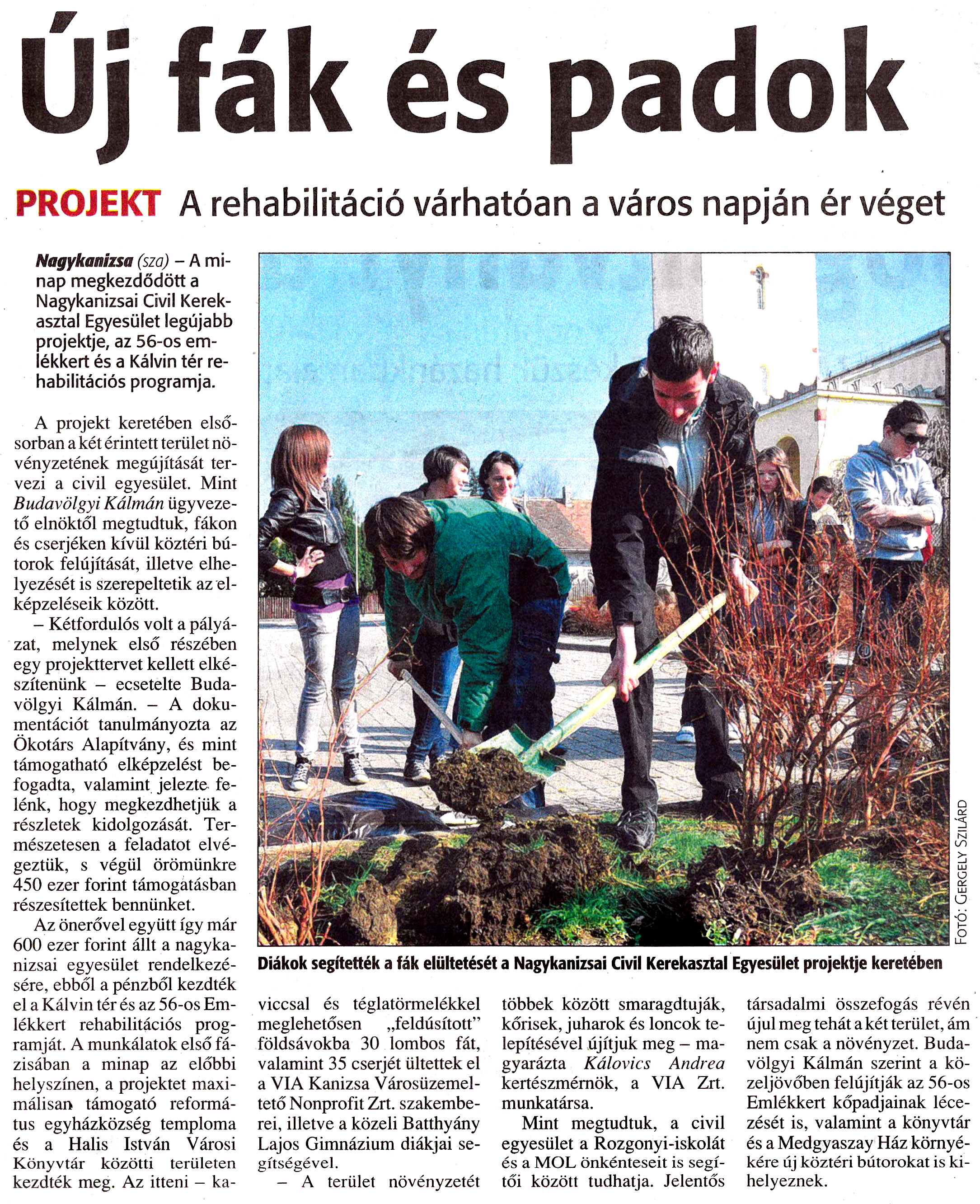 Nyilvános 1421 | 1824 | Zalai Hírlap 2011. április 1. 76. szám 11. oldal | Új fák és padok PROJEKT A rehabilitáció várhatóan a város napján ér véget Diákok segítették a fák elültetését a Nagykanizsai Civil Kerekasztal Egyesület projektje keretében Nagykanizsa (sza) - A minap megkezdődött a Nagykanizsai Civil Kerekasztal Egyesület legújabb projektje, az 56-os emlékkert és a Kálvin tér rehabilitációs programja. A projekt keretében elsősorban a két érintett terület növényzetének megújítását tervezi a civil egyesület. Mint Budavölgyi Kálmán ügyvezető elnöktől megtudtuk, fákon és cserjéken kívül köztéri bútorok felújítását, illetve elhelyezését is szerepeltetik az elképzeléseik között. - Kétfordulós volt a pályázat, melynek első részében egy projekttervet kellett elkészítenünk - ecsetelte Budavölgyi Kálmán. - A dokumentációt tanulmányozta az Ökotárs Alapítvány, és mint támogatható elképzelést befogadta, valamint jelezte felénk, hogy megkezdhetjük a részletek kidolgozását. Természetesen a feladatot elvégeztük, s végül örömünkre 450 ezer forint támogatásban részesítettek bennünket. Az önerővel együtt így már 600 ezer forint állt a nagykanizsai egyesület rendelkezésére, ebből a pénzből kezdték el a Kálvin tér és az 56-os Emlékkert rehabilitációs programját. A munkálatok első fázisában a minap az előbbi helyszínen, a projektet maximálisan támogató református egyházközség temploma és a Halis István Városi Könyvtár közötti területen kezdték meg. Az itteni - ka- viccsal és téglatörmelékkel meglehetősen „feldúsított" földsávokba 30 lombos fát, valamint 35 cserjét ültettek el a VIA Kanizsa Városüzemeltető Nonprofit Zrt. szakemberei, illetve a közeli Batthyány Lajos Gimnázium diákjai segítségével. - A terület növényzetét többek között smaragdtuják, kőrisek, juharok és loncok telepítésével újítjuk meg - magyarázta Kálovics Andrea kertészmérnök, a VIA Zrt. munkatársa. Mint megtudtuk, a civil egyesület a Rozgonyi-iskolát és a MOL önkénteseit is segítői között tudhatja. Jelentős társadalmi összefogás révén újul meg tehát a két terület, ám nem csak a növényzet. Budavölgyi Kálmán szerint a közeljövőben felújítják az 56-os Emlékkert kőpadjainak lécezését is, valamint a könyvtár és a Medgyaszay Ház környékére új köztéri bútorokat is kihelyeznek. |