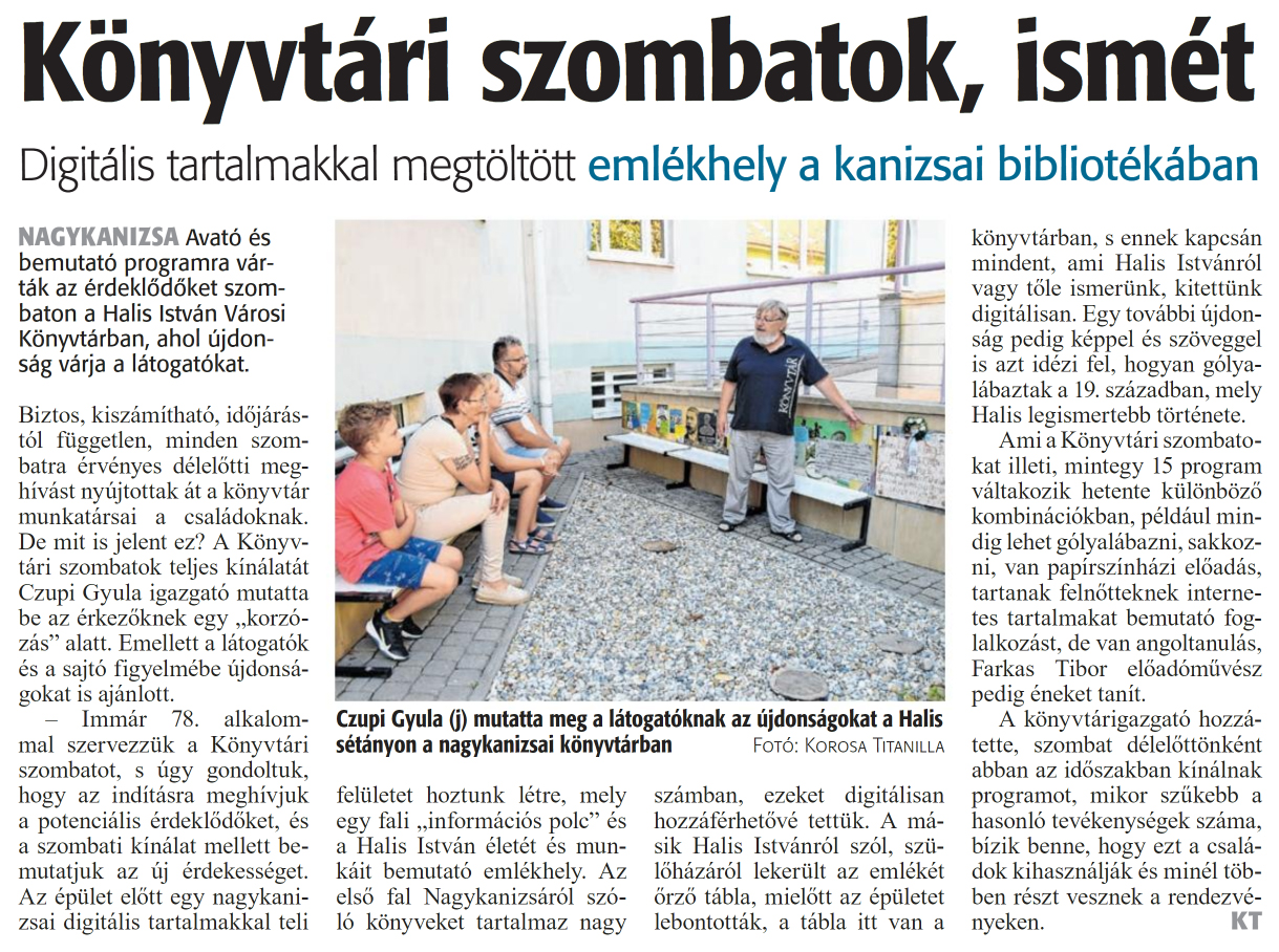 Nyilvános 1328 | 1567 | Zalai Hírlap 2024. szeptember 9. 210. szám 4. oldal | Könyvtári szombatok, ismét Digitális tartalmakkal megtöltött emlékhely a kanizsai bibliotékában NAGYKANIZSA Avató és bemutató programra várták az érdeklődőket szombaton a Halis István Városi Könyvtárban, ahol újdonság várja a látogatókat. Biztos, kiszámítható, időjárástól független, minden szombatra érvényes délelőtti meghívást nyújtottak át a könyvtár munkatársai a családoknak. De mit is jelent ez? A Könyvtári szombatok teljes kínálatát Czupi Gyula igazgató mutatta be az érkezőknek egy „korzózás" alatt. Emellett a látogatók és a sajtó figyelmébe újdonságokat is ajánlott. - Immár 78. alkalommal szervezzük a Könyvtári szombatot, s úgy gondoltuk, hogy az indításra meghívjuk a potenciális érdeklődőket, és a szombati kínálat mellett bemutatjuk az új érdekességet. Az épület előtt egy nagykanizsai digitális tartalmakkal teli felületet hoztunk létre, mely egy fali „információs polc" és a Halis István életét és munkáit bemutató emlékhely. Az első fal Nagykanizsáról szóló könyveket tartalmaz nagy számban, ezeket digitálisan hozzáférhetővé tettük. A másik Halis Istvánról szól, szülőházáról lekerült az emlékét őrző tábla, mielőtt az épületet lebontották, a tábla itt van a könyvtárban, s ennek kapcsán mindent, ami Halis Istvánról vagy tőle ismerünk, kitettünk digitálisan. Egy további újdonság pedig képpel és szöveggel is azt idézi fel, hogyan gólyalábaztak a 19. században, mely Halis legismertebb története. Ami a Könyvtári szombatokat illeti, mintegy 15 program váltakozik hetente különböző kombinációkban, például mindig lehet gólyalábazni, sakkozni, van papírszínházi előadás, tartanak felnőtteknek internetes tartalmakat bemutató foglalkozást, de van angoltanulás, Farkas Tibor előadóművész pedig éneket tanít. A könyvtárigazgató hozzátette, szombat délelőttönként abban az időszakban kínálnak programot, mikor szűkebb a hasonló tevékenységek száma, bízik benne, hogy ezt a családok kihasználják és minél többen részt vesznek a rendezvényeken. KT Czupi Gyula (j) mutatta meg a látogatóknak az újdonságokat a Halis sétányon a nagykanizsai könyvtárban Fotó: Korosa Titanilla |