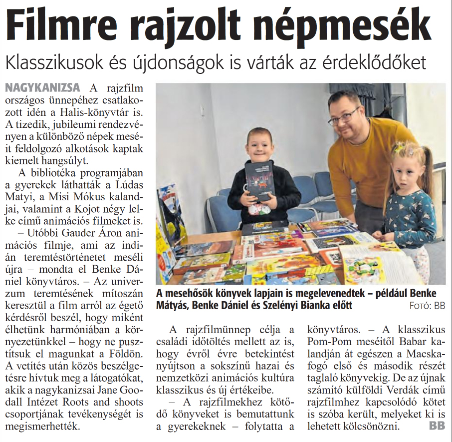 Nyilvános 1008 | 1241 | Zalai Hírlap 2024. november 18. 268. szám 16. oldal | Filmre rajzolt népmesék Klasszikusok és újdonságok is várták az érdeklődőket NAGYKANIZSA A rajzfilm országos ünnepéhez csatlakozott idén a Halis-könyvtár is. A tizedik, jubileumi rendezvényen a különböző népek meséit feldolgozó alkotások kaptak kiemelt hangsúlyt. A bibliotéka programjában a gyerekek láthatták a Lúdas Matyi, a Misi Mókus kalandjai, valamint a Kojot négy lelke című animációs filmeket is. - Utóbbi Gauder Áron animációs filmje, ami az indián teremtéstörténetet meséli újra - mondta el Benke Dániel könyvtáros. - Az univerzum teremtésének mítoszán keresztül a film arról az égető kérdésről beszél, hogy miként élhetünk harmóniában a környezetünkkel - hogy ne pusztítsuk el magunkat a Földön. A vetítés után közös beszélgetésre hívtuk meg a látogatókat, akik a nagykanizsai Jane Goo-dall Intézet Roots and shoots csoportjának tevékenységét is megismerhették. A rajzfilmünnep célja a családi időtöltés mellett az is, hogy évről évre betekintést nyújtson a sokszínű hazai és nemzetközi animációs kultúra klasszikus és új értékeibe. - A rajzfilmekhez kötődő könyveket is bemutattunk a gyerekeknek - folytatta a könyvtáros. - A klasszikus Pom-Pom meséitől Babar kalandján át egészen a Macskafogó első és második részét taglaló könyvekig. De az újnak számító külföldi Verdák című rajzfilmhez kapcsolódó kötet is szóba került, melyeket ki is lehetett kölcsönözni. BB A mesehősök könyvek lapjain is megelevenedtek - például Benke Mátyás, Benke Dániel és Szelényi Bianka előtt Fotó: BB |