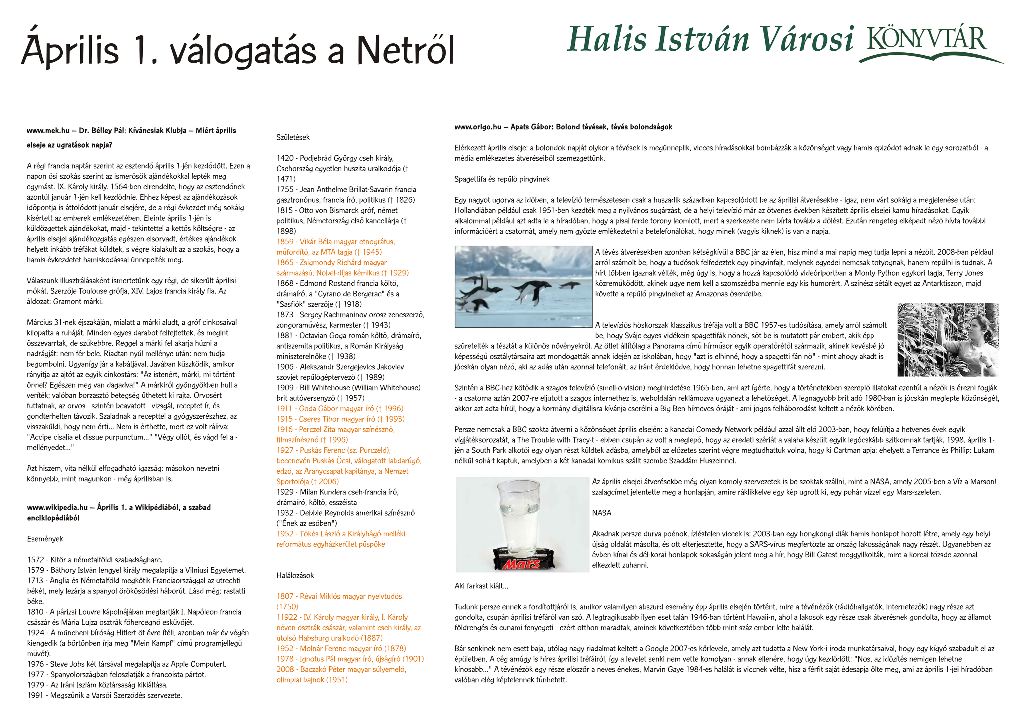 Nyilvános 1451 | 3201 | Április 1 - Válogatás a Netről | www.mek.hu – Dr. Bélley Pál: Kíváncsiak Klubja – Miért április elseje az ugratások napja? A régi francia naptár szerint az esztendõ április 1-jén kezdõdött. Ezen a napon õsi szokás szerint az ismerõsök ajándékokkal lepték meg egymást. IX. Károly király. 1564-ben elrendelte, hogy az esztendõnek azontúl január 1-jén kell kezdõdnie. Ehhez képest az ajándékozások idõpontja is áttolódott január elsejére, de a régi évkezdet még sokáig kísértett az emberek emlékezetében. Eleinte április 1-jén is küldözgettek ajándékokat, majd - tekintettel a kettõs költségre - az április elsejei ajándékozgatás egészen elsorvadt, értékes ajándékok helyett inkább tréfákat küldtek, s végre kialakult az a szokás, hogy a hamis évkezdetet hamiskodással ünnepelték meg. Válaszunk illusztrálásaként ismertetünk egy régi, de sikerült áprilisi mókát. Szerzõje Toulouse grófja, XIV. Lajos francia király fia. Az áldozat: Gramont márki. Március 31-nek éjszakáján, mialatt a márki aludt, a gróf cinkosaival kilopatta a ruháját. Minden egyes darabot felfejtettek, és megint összevarrtak, de szûkebbre. Reggel a márki fel akarja húzni a nadrágját: nem fér bele. Riadtan nyúl mellénye után: nem tudja begombolni. Ugyanígy jár a kabátjával. Javában küszködik, amikor rányitja az ajtót az egyik cinkostárs: "Az istenért, márki, mi történt önnel? Egészen meg van dagadva!" A márkiról gyöngyökben hull a veríték; valóban borzasztó betegség üthetett ki rajta. Orvosért futtatnak, az orvos - szintén beavatott - vizsgál, receptet ír, és gondterhelten távozik. Szaladnak a recepttel a gyógyszerészhez, az visszaküldi, hogy nem érti... Nem is érthette, mert ez volt ráírva: "Accipe cisalia et dissue purpunctum..." "Végy ollót, és vágd fel a - mellényedet..." Azt hiszem, vita nélkül elfogadható igazság: másokon nevetni könnyebb, mint magunkon - még áprilisban is. www.wikipedia.hu – Április 1. a Wikipédiából, a szabad enciklopédiából Események 1572 - Kitör a németalföldi szabadságharc. 1579 - Báthory István lengyel király megalapítja a Vilniusi Egyetemet. 1713 - Anglia és Németalföld megkötik Franciaországgal az utrechti békét, mely lezárja a spanyol örökösödési háborút. Lásd még: rastatti béke. 1810 - A párizsi Louvre kápolnájában megtartják I. Napóleon francia császár és Mária Lujza osztrák főhercegnő esküvőjét. 1924 - A müncheni bíróság Hitlert öt évre ítéli, azonban már év végén kiengedik (a börtönben írja meg "Mein Kampf" című programjellegű művét). 1976 - Steve Jobs két társával megalapítja az Apple Computert. 1977 - Spanyolországban feloszlatják a francoista pártot. 1979 - Az Iráni Iszlám köztársaság kikiáltása. 1991 - Megszűnik a Varsói Szerződés szervezete. Születések 1420 - Podjebrád György cseh király, Csehország egyetlen huszita uralkodója († 1471) 1755 - Jean Anthelme Brillat-Savarin francia gasztronónus, francia író, politikus († 1826) 1815 - Otto von Bismarck gróf, német politikus, Németország első kancellárja († 1898) 1859 - Vikár Béla magyar etnográfus, műfordító, az MTA tagja († 1945) 1865 - Zsigmondy Richárd magyar származású, Nobel-díjas kémikus († 1929) 1868 - Edmond Rostand francia költő, drámaíró, a "Cyrano de Bergerac" és a "Sasfiók" szerzője († 1918) 1873 - Sergey Rachmaninov orosz zeneszerző, zongoraművész, karmester († 1943) 1881 - Octavian Goga román költő, drámaíró, antiszemita politikus, a Román Királyság miniszterelnöke († 1938) 1906 - Alekszandr Szergejevics Jakovlev szovjet repülőgéptervező († 1989) 1909 - Bill Whitehouse (William Whitehouse) brit autóversenyző († 1957) 1911 - Goda Gábor magyar író († 1996) 1915 - Cseres Tibor magyar író († 1993) 1916 - Perczel Zita magyar színésznő, filmszínésznő († 1996) 1927 - Puskás Ferenc (sz. Purczeld), becenevén Puskás Öcsi, válogatott labdarúgó, edző, az Aranycsapat kapitánya, a Nemzet Sportolója († 2006) 1929 - Milan Kundera cseh-francia író, drámaíró, költő, esszéista 1932 - Debbie Reynolds amerikai színésznő ("Ének az esőben") 1952 - Tőkés László a Királyhágó-melléki református egyházkerület püspöke Halálozások 1807 - Révai Miklós magyar nyelvtudós (1750) 11922 - IV. Károly magyar király, I. Károly néven osztrák császár, valamint cseh király, az utolsó Habsburg uralkodó (1887) 1952 - Molnár Ferenc magyar író (1878) 1978 - Ignotus Pál magyar író, újságíró (1901) 2008 - Baczakó Péter magyar súlyemelő, olimpiai bajnok (1951) www.origo.hu – Apats Gábor: Bolond tévések, tévés bolondságok Elérkezett április elseje: a bolondok napját olykor a tévések is megünneplik, vicces híradásokkal bombázzák a közönséget vagy hamis epizódot adnak le egy sorozatból - a média emlékezetes átveréseiből szemezgettünk. Spagettifa és repülő pingvinek Egy nagyot ugorva az időben, a televízió természetesen csak a huszadik században kapcsolódott be az áprilisi átverésekbe - igaz, nem várt sokáig a megjelenése után: Hollandiában például csak 1951-ben kezdték meg a nyilvános sugárzást, de a helyi televízió már az ötvenes években készített április elsejei kamu híradásokat. Egyik alkalommal például azt adta le a híradóban, hogy a pisai ferde torony leomlott, mert a szerkezete nem bírta tovább a dőlést. Ezután rengeteg elképedt néző hívta további információért a csatornát, amely nem győzte emlékeztetni a betelefonálókat, hogy minek (vagyis kiknek) is van a napja. A tévés átverésekben azonban kétségkívül a BBC jár az élen, hisz mind a mai napig meg tudja lepni a nézőit. 2008-ban például arról számolt be, hogy a tudósok felfedeztek egy pingvinfajt, m
