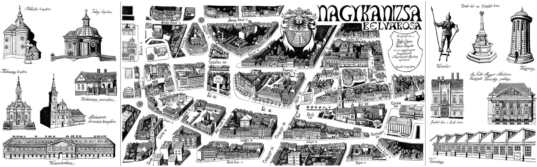 Nyilvános 2417 | 9059 | Nagykanizsa belvárosa madártávlati képe - Somogyi Győző alkotása - nagy méretben megtekinthető a könyvtárban, kis méretben meg is vásárolható a könyvtártól: | A 30x100 cm-es Nagykanizsa belvárosa madártávlati kép érvényes olvasói tagsággal rendelkezők számára 200 Ft-ba kerül, egyébként 300 Ft, fóliázott változatban 600 Ft (olvasóinknak 500 Ft). |