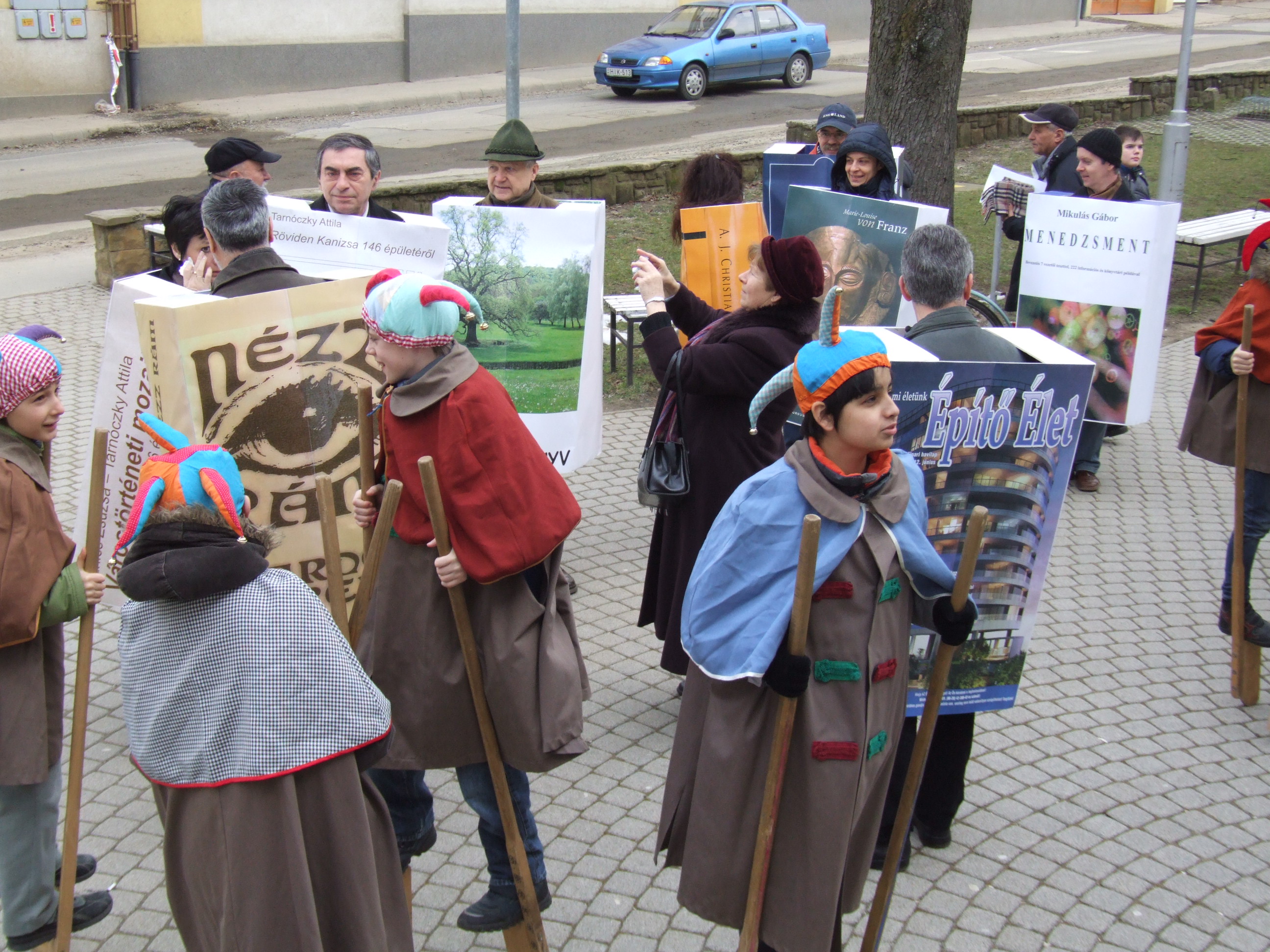 Nyilvános 1466 | 3115 | 2013. február 9. A farsangi fánkfesztiválra készülve felhívásban kértük olvasóinkat, hogy öltsék magukra kedves könyvüket. Egy „könyvespolcnyi” jelentkező vette magára kedves olvasmányát, az ő vonulásukról készültek ezek a képek. A környezetükben néhol láthatók a Nagykanizsai Gólyalábasok, akik szintén a könyvtárhoz kötődnek. A „felvonuló kötetek” a könyvtár épületében még megtekinthetők. | |