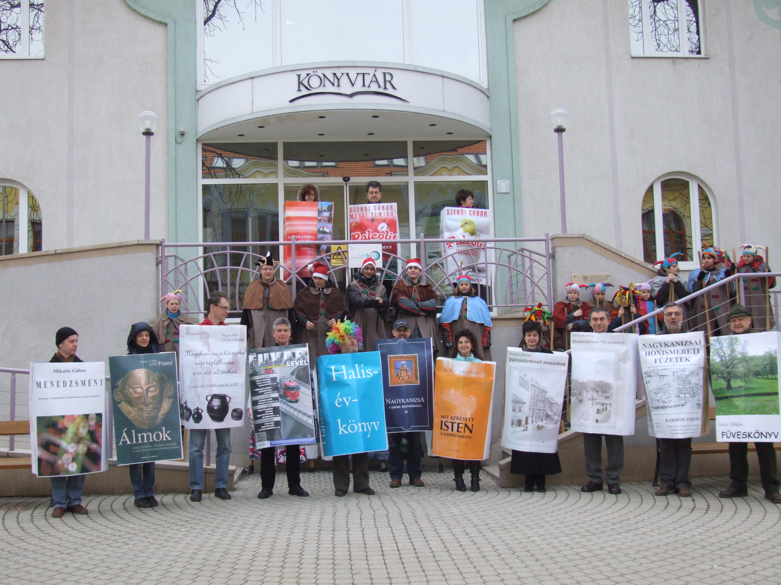 Nyilvános 1459 | 3050 | 2013. február 9. A farsangi fánkfesztiválra készülve felhívásban kértük olvasóinkat, hogy öltsék magukra kedves könyvüket. Egy „könyvespolcnyi” jelentkező vette magára kedves olvasmányát, az ő vonulásukról készültek ezek a képek. A környezetükben néhol láthatók a Nagykanizsai Gólyalábasok, akik szintén a könyvtárhoz kötődnek. A „felvonuló kötetek” a könyvtár épületében még megtekinthetők. | |
