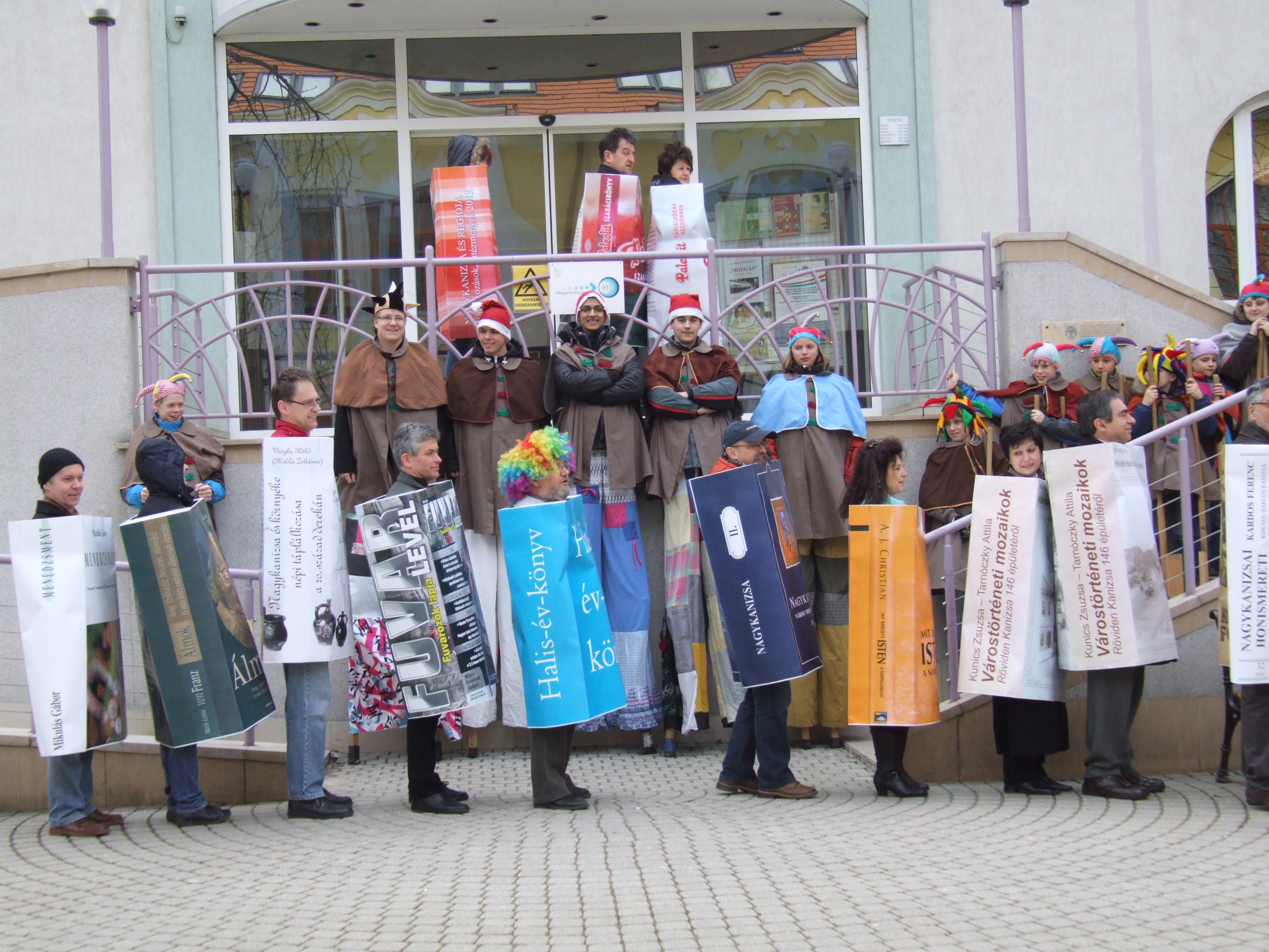 Nyilvános 1466 | 3090 | 2013. február 9. A farsangi fánkfesztiválra készülve felhívásban kértük olvasóinkat, hogy öltsék magukra kedves könyvüket. Egy „könyvespolcnyi” jelentkező vette magára kedves olvasmányát, az ő vonulásukról készültek ezek a képek. A környezetükben néhol láthatók a Nagykanizsai Gólyalábasok, akik szintén a könyvtárhoz kötődnek. A „felvonuló kötetek” a könyvtár épületében még megtekinthetők. | |