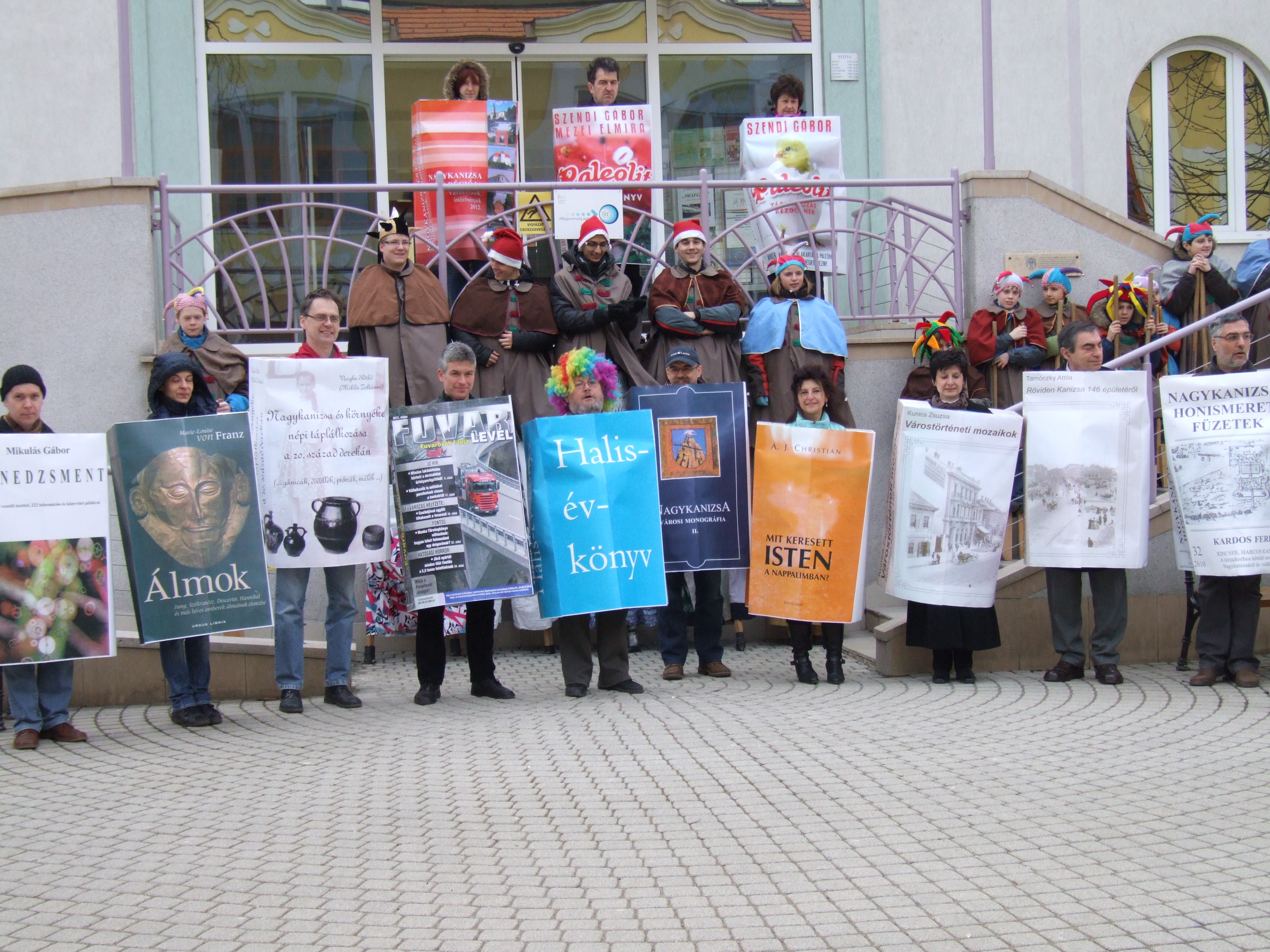 Nyilvános 1467 | 3093 | 2013. február 9. A farsangi fánkfesztiválra készülve felhívásban kértük olvasóinkat, hogy öltsék magukra kedves könyvüket. Egy „könyvespolcnyi” jelentkező vette magára kedves olvasmányát, az ő vonulásukról készültek ezek a képek. A környezetükben néhol láthatók a Nagykanizsai Gólyalábasok, akik szintén a könyvtárhoz kötődnek. A „felvonuló kötetek” a könyvtár épületében még megtekinthetők. | |