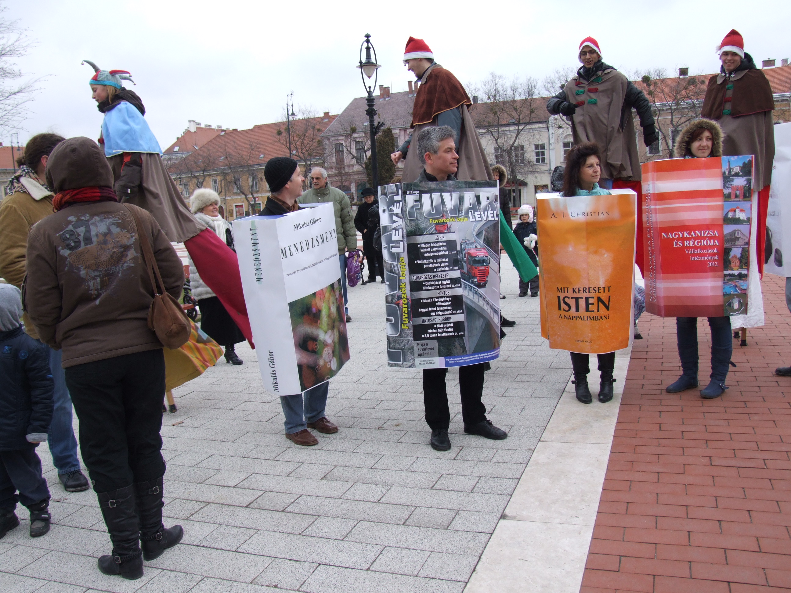 Nyilvános 1087 | 1425 | 2013. február 9. A farsangi fánkfesztiválra készülve felhívásban kértük olvasóinkat, hogy öltsék magukra kedves könyvüket. Egy „könyvespolcnyi” jelentkező vette magára kedves olvasmányát, az ő vonulásukról készültek ezek a képek. A környezetükben néhol láthatók a Nagykanizsai Gólyalábasok, akik szintén a könyvtárhoz kötődnek. A „felvonuló kötetek” a könyvtár épületében még megtekinthetők. | |