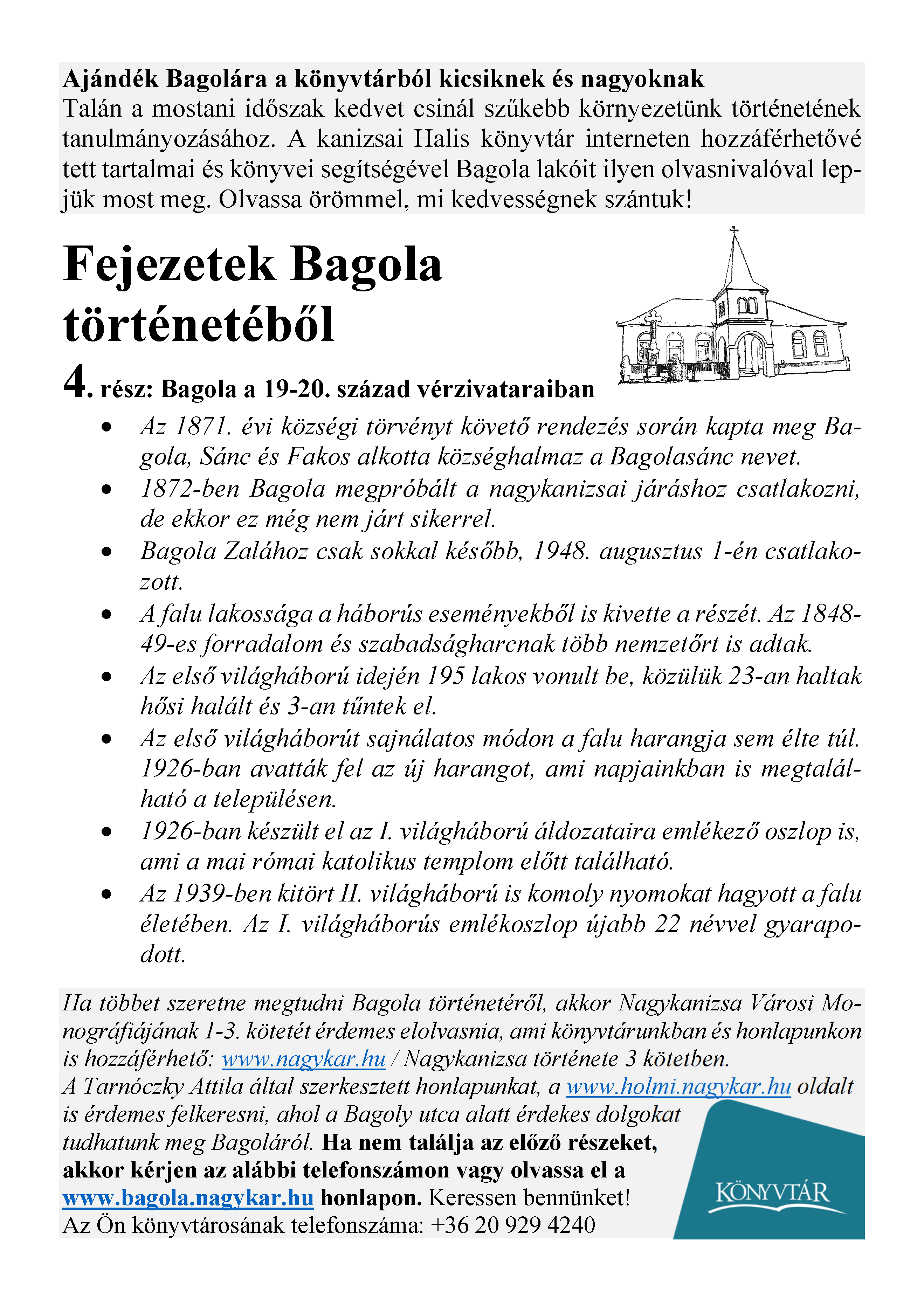 Nyilvános 1777 | 2708 | Rövid leírás | Teljes leírás (2.28 KB) | Megjelenés: 2021. május 7. Ajándék Bagolára a könyvtárból kicsiknek és nagyoknak Talán a mostani időszak kedvet csinál szűkebb környezetünk történetének tanulmányozásához. A kanizsai Halis könyvtár interneten hozzáférhetővé tett tartalmai és könyvei segítségével Bagola lakóit ilyen olvasnivalóval lepjük most meg. Olvassa örömmel, mi kedvességnek szántuk! Fejezetek Bagola történetéből 4. rész: Bagola a 19-20. század vérzivataraiban • Az 1871. évi községi törvényt követő rendezés során kapta meg Bagola, Sánc és Fakos alkotta községhalmaz a Bagolasánc nevet. • 1872-ben Bagola megpróbált a nagykanizsai járáshoz csatlakozni, de ekkor ez még nem járt sikerrel. • Bagola Zalához csak sokkal később, 1948. augusztus 1-én csatlakozott. • A falu lakossága a háborús eseményekből is kivette a részét. Az 1848-49-es forradalom és szabadságharcnak több nemzetőrt is adtak. • Az első világháború idején 195 lakos vonult be, közülük 23-an haltak hősi halált és 3-an tűntek el. • Az első világháborút sajnálatos módon a falu harangja sem élte túl. 1926-ban avatták fel az új harangot, ami napjainkban is megtalálható a településen. • 1926-ban készült el az I. világháború áldozataira emlékező oszlop is, ami a mai római katolikus templom előtt található. • Az 1939-ben kitört II. világháború is komoly nyomokat hagyott a falu életében. Az I. világháborús emlékoszlop újabb 22 névvel gyarapodott. Ha többet szeretne megtudni Bagola történetéről, akkor Nagykanizsa Városi Monográfiájának 1-3. kötetét érdemes elolvasnia, ami könyvtárunkban és honlapunkon is hozzáférhető: www.nagykar.hu / Nagykanizsa története 3 kötetben. A Tarnóczky Attila által szerkesztett honlapunkat, a www.holmi.nagykar.hu oldalt is érdemes felkeresni, ahol a Bagoly utca alatt érdekes dolgokat tudhatunk meg Bagoláról. Ha nem találja az előző részeket, akkor kérjen az alábbi telefonszámon vagy olvassa el a www.bagola.nagykar.hu honlapon. Keressen bennünket! Az Ön könyvtárosának telefonszáma: +36 20 929 4240 |