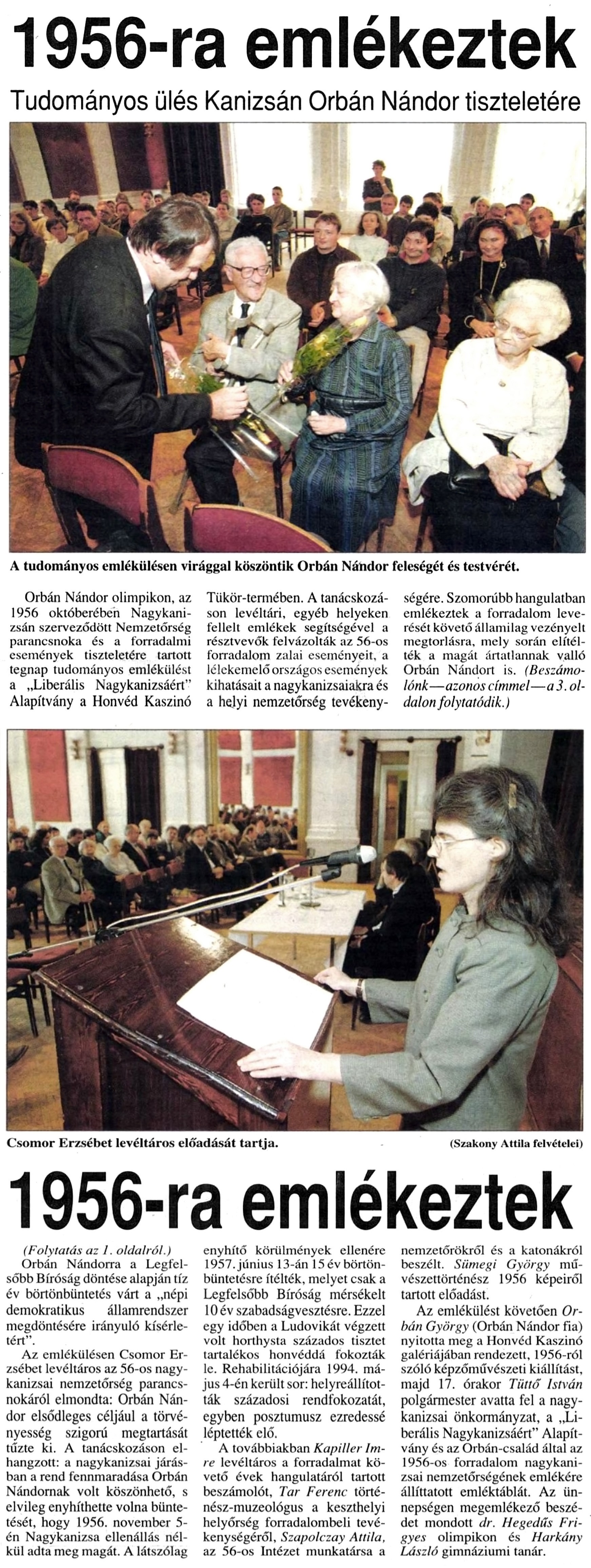 Nyilvános 1314 | 2101 | Zalai Hírlap 1998. október 16. 243. szám 1, 3. oldal | 1956-ra emlékeztek Tudományos ülés Kanizsán Orbán Nándor tiszteletére A tudományos emlékülésen virággal köszöntik Orbán Nándor feleségét és testvérét. Orbán Nándor olimpikon, az 1956 októberében Nagykanizsán szerveződött Nemzetőrség parancsnoka és a forradalmi események tiszteletére tartott tegnap tudományos emlékülést a „Liberális Nagykanizsáért” Alapítvány a Honvéd Kaszinó Tükör-termében. A tanácskozáson levéltári, egyéb helyeken fellelt emlékek segítségével a résztvevők felvázolták az 56-os forradalom zalai eseményeit, a lélekemelő országos események kihatásait a nagykanizsaiakra és a helyi nemzetőrség tevékenységére. Szomorúbb hangulatban emlékeztek a forradalom leverését követő államilag vezényelt megtorlásra, mely során elítélték a magát ártatlannak valló Orbán Nándort is. (Beszámolónk—azonos címmel—a 3. oldalon folytatódik.) Csömör Erzsébet levéltáros előadását tartja. (Szakony Attila felvételei) 1956-ra emlékeztek (Folytatás az 1. oldalról.) Orbán Nándorra a Legfelsőbb Bíróság döntése alapján tíz év börtönbüntetés várt a „népi demokratikus államrendszer megdöntésére irányuló kísérletért”. Az emlékülésen Csömör Erzsébet levéltáros az 56-os nagy- kanizsai nemzetőrség parancsnokáról elmondta: Orbán Nándor elsődleges céljául a törvényesség szigorú megtartását tűzte ki. A tanácskozáson elhangzott: a nagykanizsai járásban a rend fennmaradása Orbán Nándornak volt köszönhető, s elvileg enyhíthette volna büntetését, hogy 1956. november 5-én Nagykanizsa ellenállás nélkül adta meg magát. A látszólag enyhítő körülmények ellenére 1957. június 13-án 15 év börtönbüntetésre ítélték, melyet csak a Legfelsőbb Bíróság mérsékelt 10 év szabadságvesztésre. Ezzel egy időben a Ludovikát végzett volt horthysta százados tisztet tartalékos honvéddé fokozták le. Rehabilitációjára 1994. május 4-én került sor: helyreállították századosi rendfokozatát, egyben posztumusz ezredessé léptették elő. A továbbiakban Kapiller Imre levéltáros a forradalmat követő évek hangulatáról tartott beszámolót, Tar Ferenc történész-muzeológus a keszthelyi helyőrség forradalombeli tevékenységéről, Szapolczay Attila, az 56-os Intézet munkatársa a nemzetőrökről és a katonákról beszélt. Sümegi György művészettörténész 1956 képeiről tartott előadást. Az emlékülést követően Orbán György (Orbán Nándor fia) nyitotta meg a Honvéd Kaszinó galériájában rendezett, 1956-ról szóló képzőművészeti kiállítást, majd 17. órakor Tüttő István polgármester avatta fel a nagykanizsai önkormányzat, a „Liberális Nagykanizsáért” Alapítvány és az Orbán-család által az 1956-os forradalom nagykanizsai nemzetőrségének emlékére állíttatott emléktáblát. Az ünnepségen megemlékező beszédet mondott dr. Hegedűs Frigyes olimpikon és Harkány László gimnáziumi tanár. |