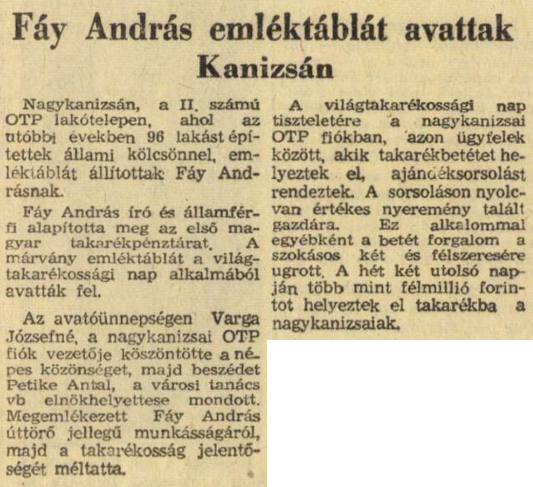 Nyilvános 1242 | 1972 | Rövid leírás | Teljes leírás (1.16 KB) | Zalai Hírlap 1969. november 2. 12. oldal Fáy András emléktáblát avattak Kanizsán Nagykanizsán, a II. számú OTP lakótelepen, ahol az utóbbi években 96 lakást építettek állami kölcsönnel, emléktáblát állítottak Fáy Andrásnak. Fáy András író és államférfi alapította meg az első magyar takarékpénztárat. A márvány emléktáblát a világtakarékossági nap alkalmából avatták fel. Az avatóünnepségen Varga Józsefné, a nagykanizsai OTP fiók vezetője köszöntötte a népes közönséget, majd beszédet Petike Antal, a városi tanács vb elnökhelyettese mondott. Megemlékezett Fáy András úttörő jellegű munkásságáról, majd a takarékosság jelentőségét méltatta. A világtakarékossági nap tiszteletére a nagykanizsai OTP fiókban, azon ügyfelek között, akik takarékbetétet helyeztek el, ajándéksorsolást rendeztek. A sorsoláson nyolcvan értékes nyeremény talált gazdára. Ez alkalommal egyébként a betét forgalom a szokásos két és félszeresére ugrott. A hét két utolsó napján több mint félmillió forintot helyeztek el takarékba a nagykanizsaiak. |