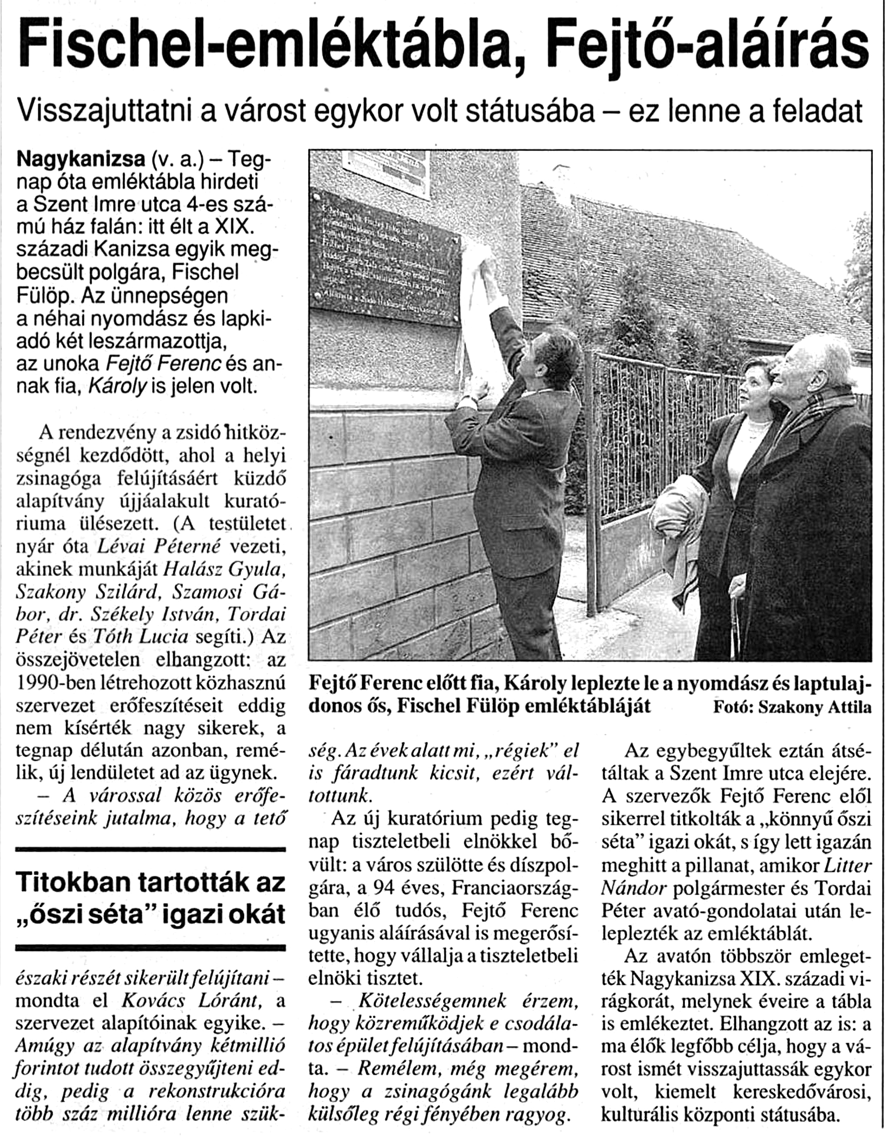 Nyilvános 1043 | 1493 | Zalai Hirlap 2003. október 14. 5. oldal | Fischel-emléktábla, Fejtő-aláírás Visszajuttatni a várost egykor volt státusába - ez lenne a feladat Nagykanizsa (v. a.) - Tegnap óta emléktábla hirdeti a Szent Imre utca 4-es számú ház falán: itt élt a XIX. századi Kanizsa egyik megbecsült polgára, Fischel Fülöp. Az ünnepségen a néhai nyomdász és lapkiadó két leszármazottja, az unoka Fejtő Ferenc és annak fia, Károly is jelen volt. A rendezvény a zsidó hitközségnél kezdődött, ahol a helyi zsinagóga felújításáért küzdő alapítvány újjáalakult kuratóriuma ülésezett. (A testületet nyár óta Lévai Péterné vezeti, akinek munkáját Halász Gyula, Szakony Szilárd, Szamosi Gábor, dr. Székely István, Tordai Péter és Tóth Lucia segíti.) Az összejövetelen elhangzott: az 1990-ben létrehozott közhasznú szervezet erőfeszítéseit eddig nem kísérték nagy sikerek, a tegnap délután azonban, remélik, új lendületet ad az ügynek. - A várossal közös erőfeszítéseink jutalma, hogy a tető északi részét sikerült felújítani - mondta el Kovács Lóránt, a szervezet alapítóinak egyike. - Amúgy az alapítvány kétmillió forintot tudott összegyűjteni eddig, pedig a rekonstrukcióra több száz millióra lenne szükség. Az évek alatt mi, „régiek” el is fáradtunk kicsit, ezért váltottunk. Az új kuratórium pedig tegnap tiszteletbeli elnökkel bővült: a város szülötte és díszpolgára, a 94 éves, Franciaországban élő tudós, Fejtő Ferenc ugyanis aláírásával is megerősítette, hogy vállalja a tiszteletbeli elnöki tisztet. - Kötelességemnek érzem, hogy közreműködjek e csodálatos épület felújításában - mondta. - Remélem, még megérem, hogy a zsinagógánk legalább külsőleg régi fényében ragyog. Az egybegyűltek eztán átsétáltak a Szent Imre utca elejére. A szervezők Fejtő Ferenc elől sikerrel titkolták a„könnyű őszi séta” igazi okát, s így lett igazán meghitt a pillanat, amikor Litter Nándor polgármester és Tordai Péter avató-gondolatai után leleplezték az emléktáblát. Az avatón többször emlegették Nagykanizsa XIX. századi virágkorát, melynek éveire a tábla is emlékeztet. Elhangzott az is: a ma élők legfőbb célja, hogy a várost ismét visszajuttassák egykor volt, kiemelt kereskedővárosi, kulturális központi státusába. Fejtő Ferenc előtt fia, Károly leplezte le a nyomdász és laptulajdonos ős, Fischel Fülöp emléktábláját Fotó: Szakony Attila |