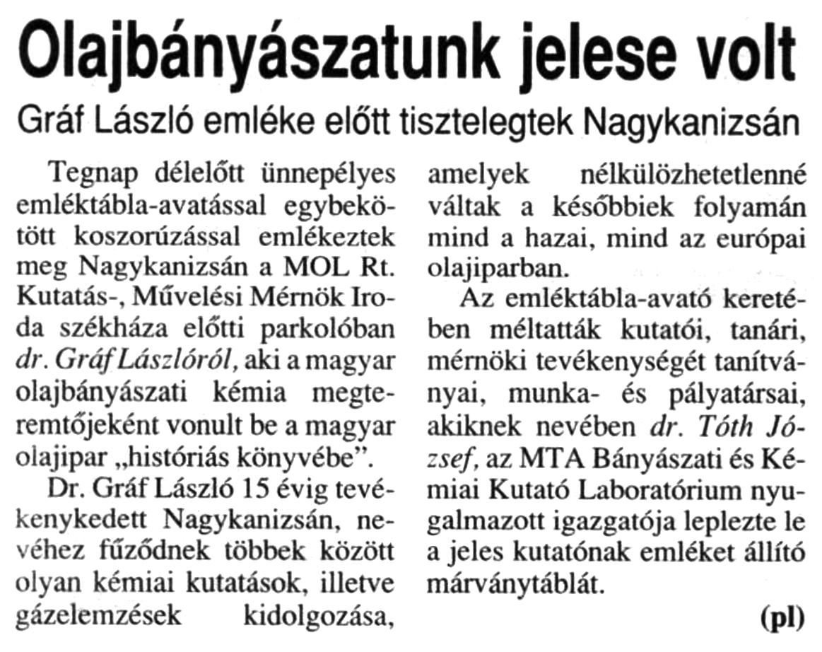 Nyilvános 930 | 1363 | Zalai Hírlap 1999. július 9. 4. oldal | Olajbányászatunk jelese volt Gráf László emléke előtt tisztelegtek Nagykanizsán Tegnap délelőtt ünnepélyes emléktábla-avatással egybekötött koszorúzással emlékeztek meg Nagykanizsán a MOL Rt. Kutatás-, Művelési Mérnök Iroda székháza előtti parkolóban dr. Gráf Lászlóról, aki a magyar olajbányászati kémia megteremtőjeként vonult be a magyar olajipar „históriás könyvébe”. Dr. Gráf László 15 évig tevékenykedett Nagykanizsán, nevéhez fűződnek többek között olyan kémiai kutatások, illetve gázelemzések kidolgozása, amelyek nélkülözhetetlenné váltak a későbbiek folyamán mind a hazai, mind az európai olajiparban. Az emléktábla-avató keretében méltatták kutatói, tanári, mérnöki tevékenységét tanítványai, munka- és pályatársai, akiknek nevében dr. Tóth József, az MTA Bányászati és Kémiai Kutató Laboratórium nyugalmazott igazgatója leplezte le a jeles kutatónak emléket állító márványtáblát. (pl) |